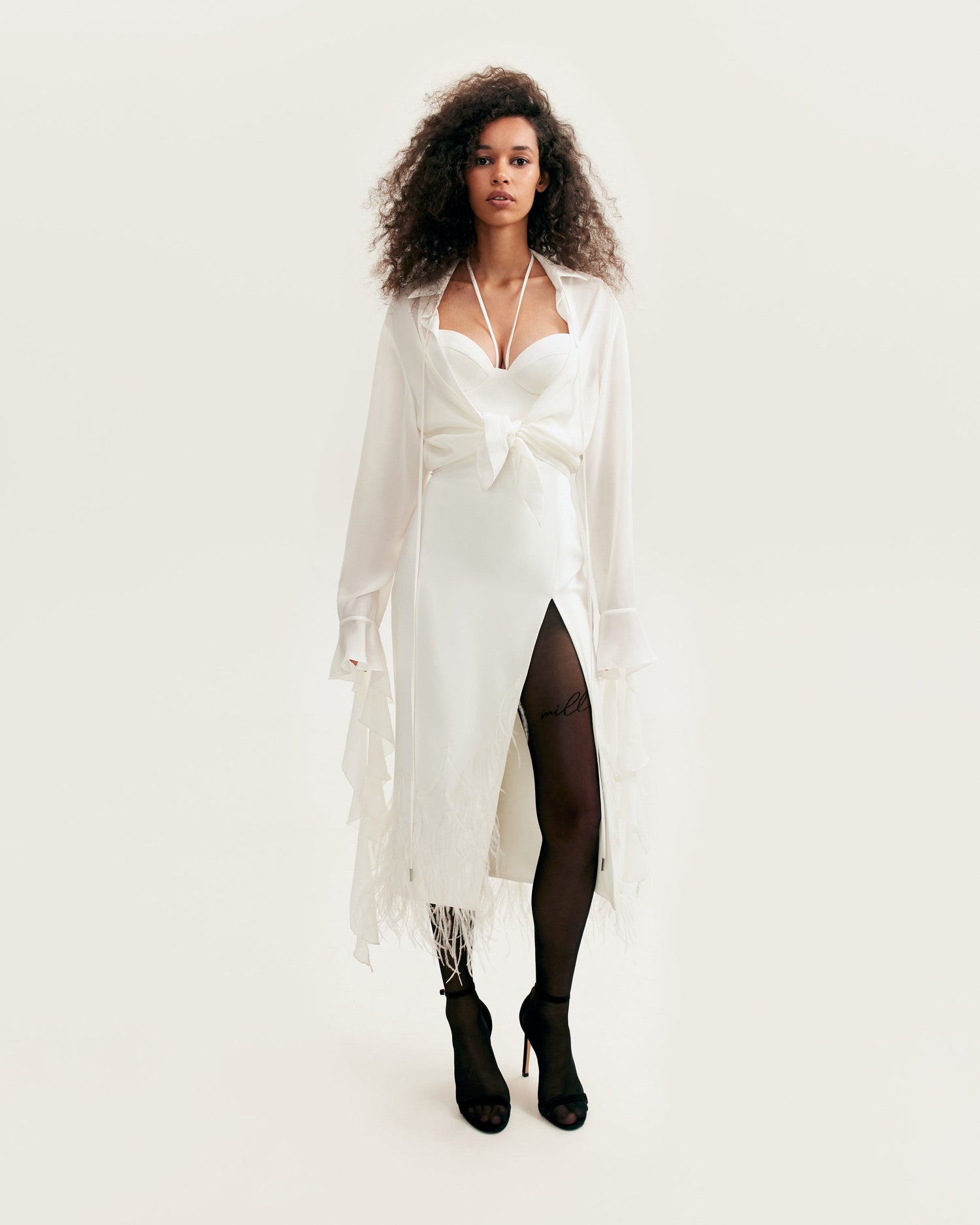 Fancy cocktail set with a romantic twist of crêpe ruffled blouse and cocktail dress with feathers