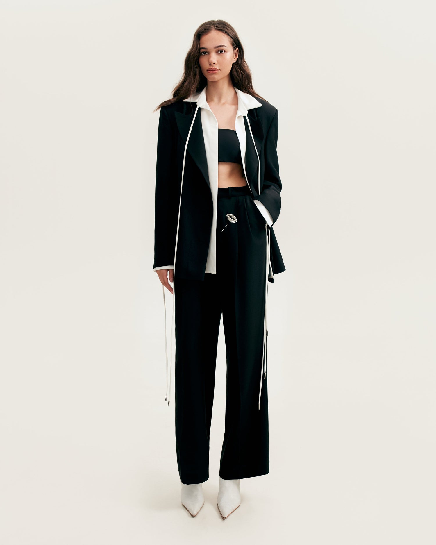 Chic classical set of black panache blazer, high-rise black suit pants, and romantic beige blouse