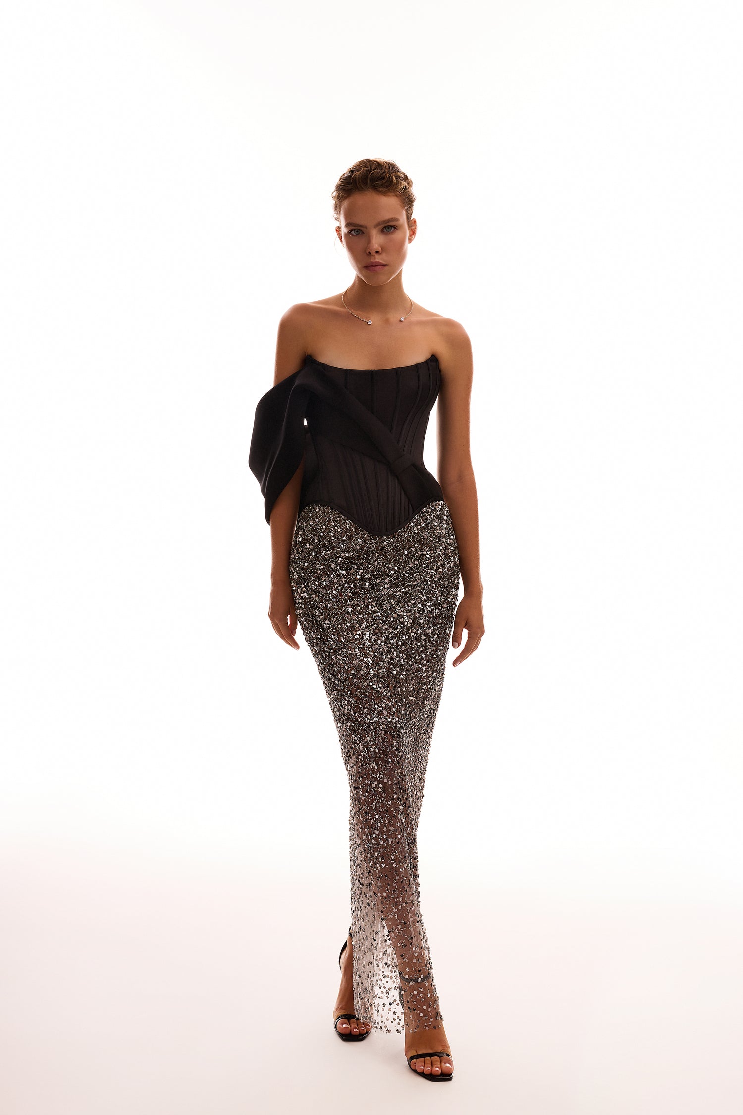 Glamorous set with structured black corset and sequined silver maxi skirt
