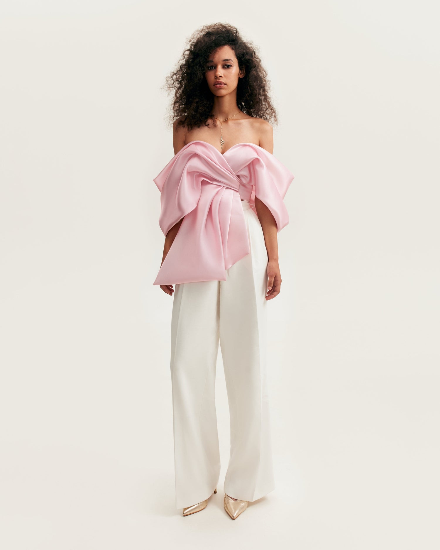 Flirtatiously graceful set of classical high-rise white suit pants and fashionista pink blouse